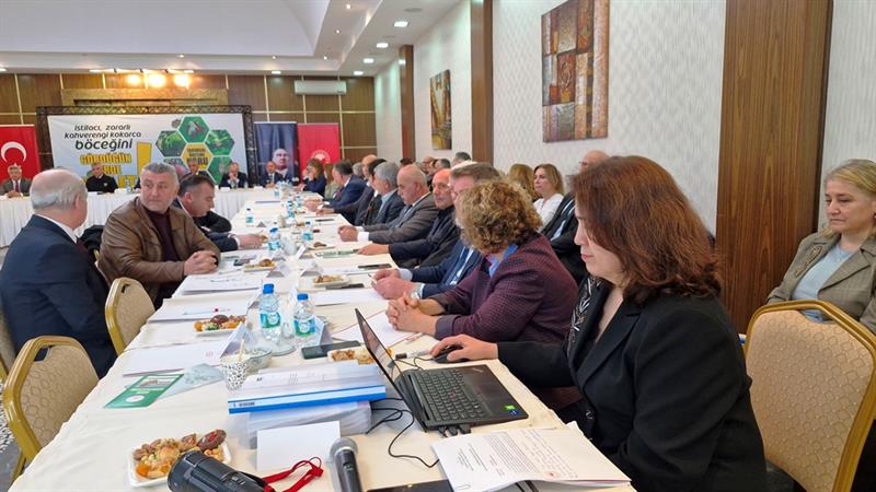 Toplantıda bir konuşma yapan İl Müdürümüz İbrahim Sağlam, ilimizde kahverengi Kokarca ile mücadelede yürütülen çalışmalar hakkında şunları söyledi:" Tarımsal üretim yapılan alanlarda büyük ekonomik kayıplara sebep olan kahverengi kokarca ile mücadelemiz; Bakanlığımız “Kahverengi Kokarca ile Mücadele Eylem Planı" gereğince, 2024 yılı bitki sağlığı uygulama programı kapsamında Entegre Mücadele prensipler doğrultusunda ve Kahverengi Kokarca teknik talimatı ve Cezbet – Öldür yönergesine göre İl müdürlüğümüz ve 17 ilçe müdürlüğü personelimizce yürütülmektedir.